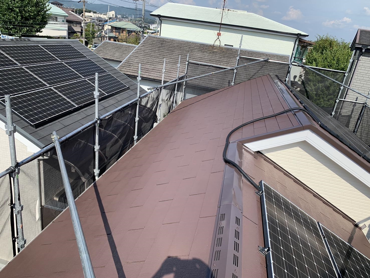 施工にあたっては、外壁が既に塗り替えられている為、屋根塗料が付着しないよう養生に配慮しました。