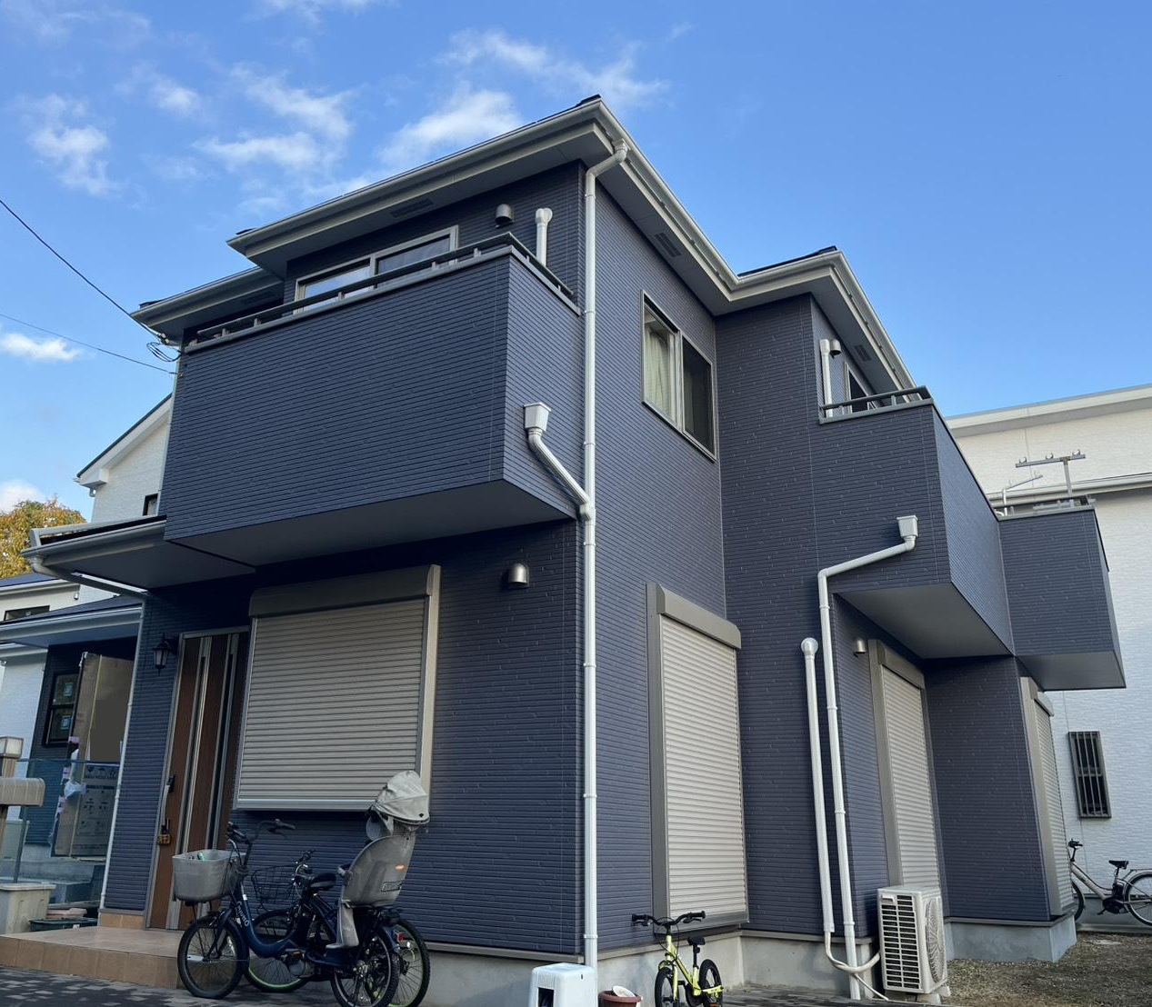 落ち着きと品格を兼ね備えた青系カラーをベースに、白色は多彩色仕上げを採用し、濃紺の外壁が建物の輪郭を引き締め、白の凹凸感ある多彩色が上質なアクセントを加えています。