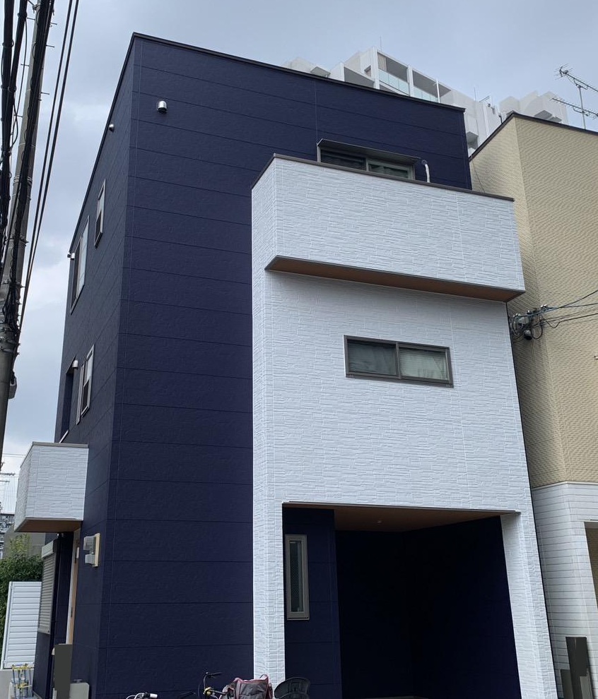 落ち着きと品格を兼ね備えた青系カラーをベースに、白色は多彩色仕上げを採用し、濃紺の外壁が建物の輪郭を引き締め、白の凹凸感ある多彩色が上質なアクセントを加えています。